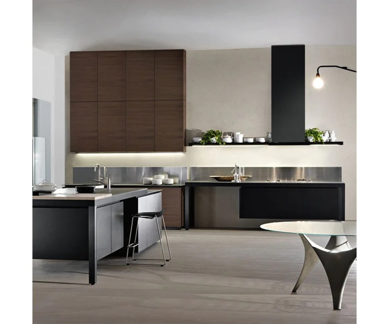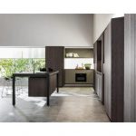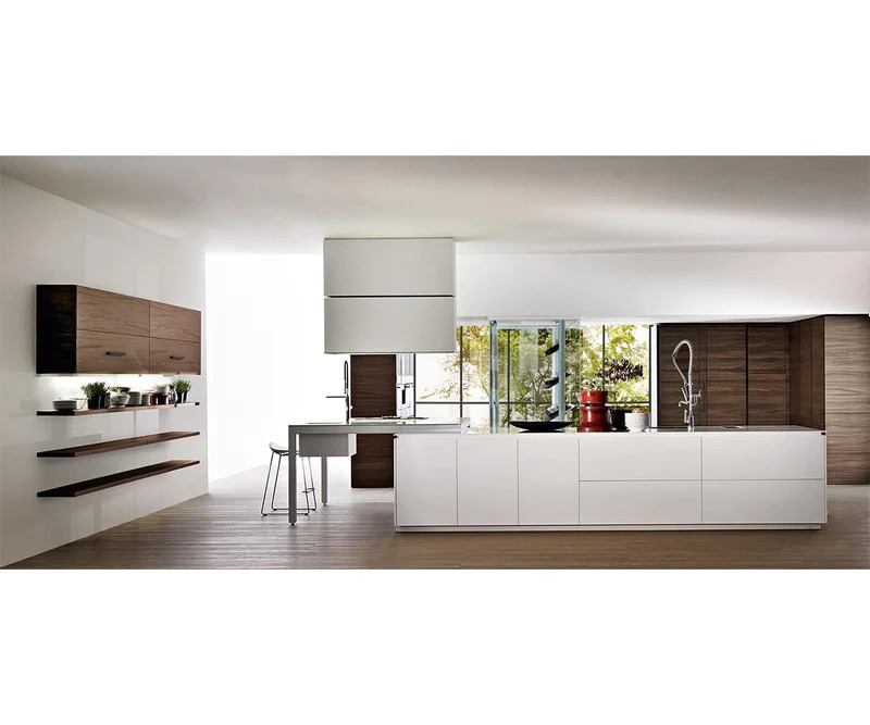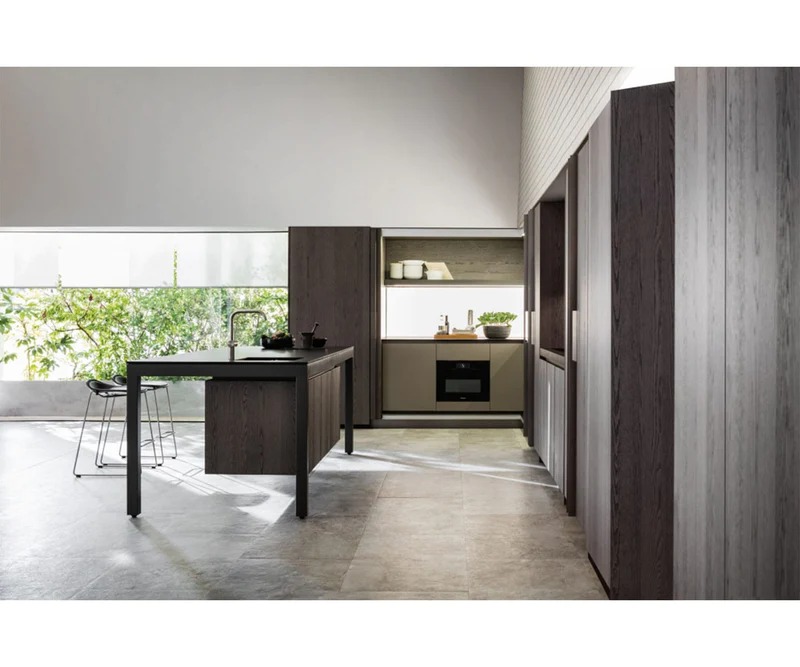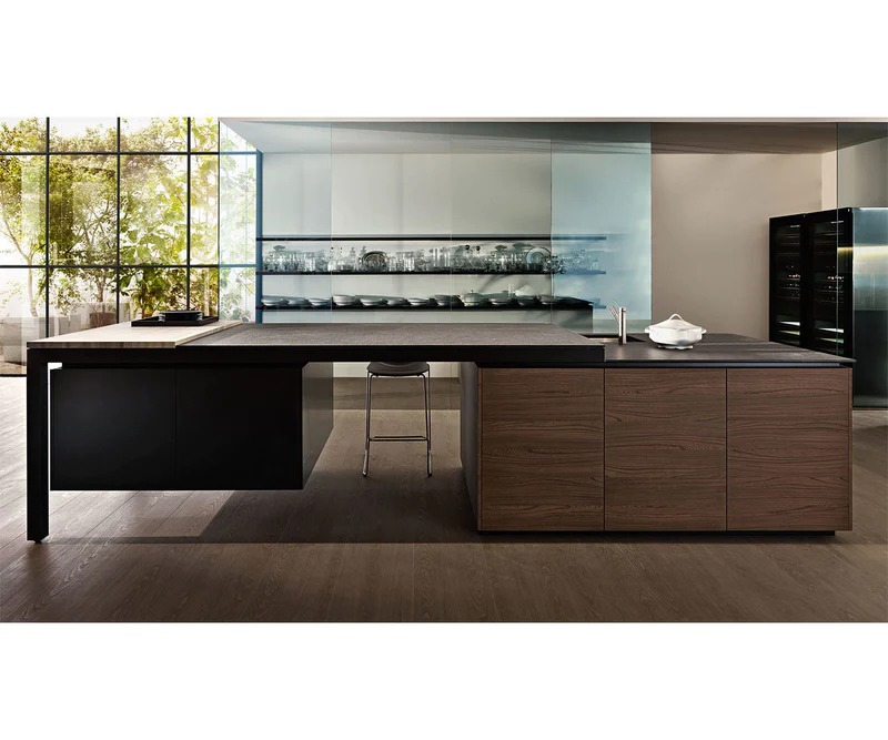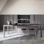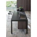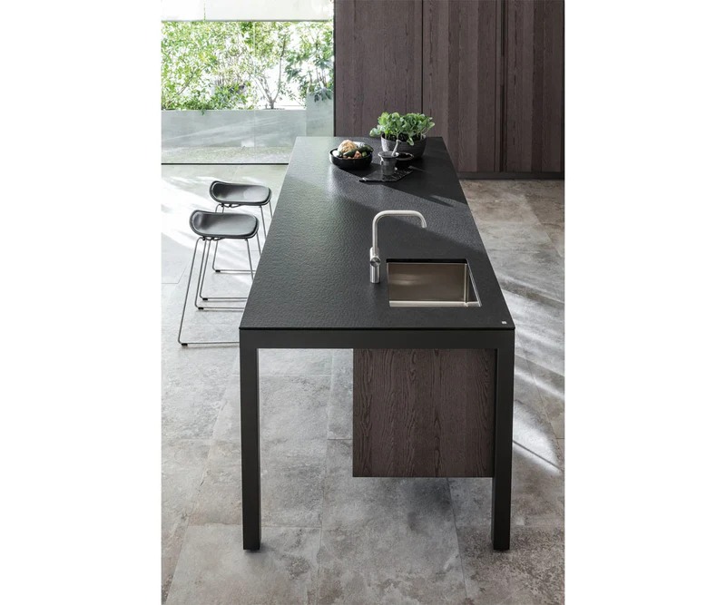 Created in 1994 by Luca Meda, Banco transformed the system of washing and cooking into a self-supported structure, patented by Dada. The new Banco redefines the look in contrasting materials and stylish black and white. The entire structure, completed with standing base units, is suspended in mid-air, with a solid aluminum frame supporting the thin worktop, which defines a horizontal line of the cabinets and is set into the frame to hide the solid interior.