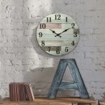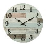The rustic clock features a vintage clock face with lightly distressed black numbers for an antique farmhouse or seaside cottage feel
