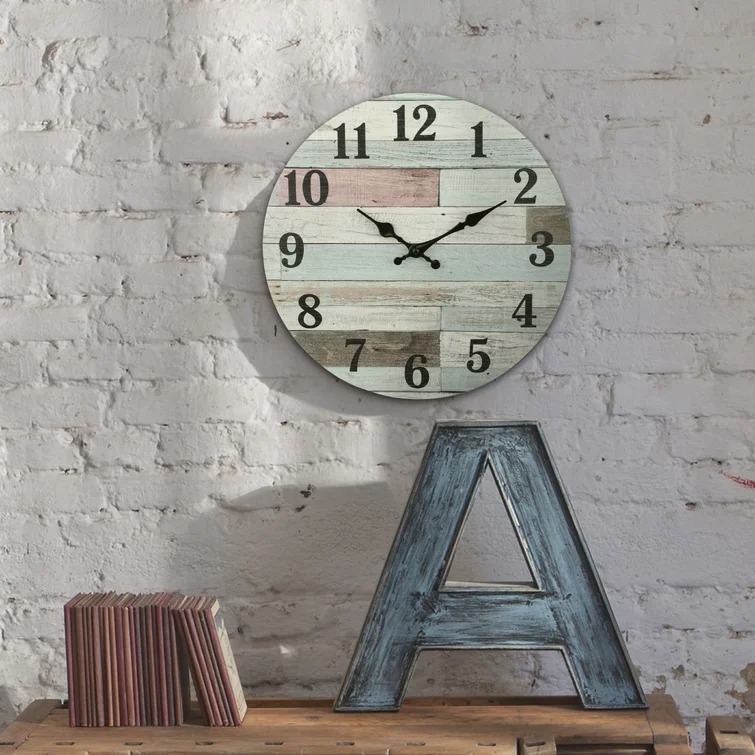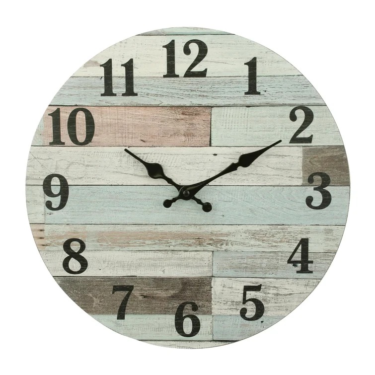 Lend a touch of farmhouse flair to your walls with this charming wall clock! The face of the clock features a graphic wood clapboard motif in weathered hues, while the easy-to-read dial showcases bold Arabic numerals in semi-opaque black print. A battery-operated movement keeps the classic black spade hour and minute hands ticking away in time (batteries not included), while a keyhole cutout makes wall-mounting a breeze.