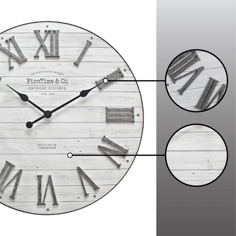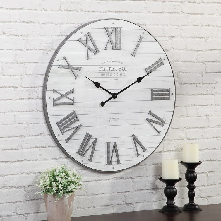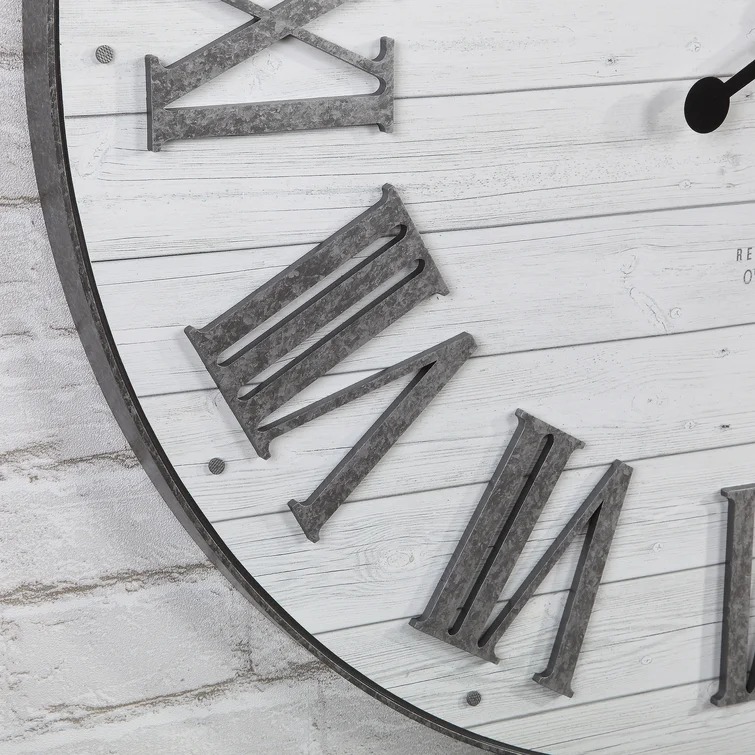Add the perfect mix of farmhouse decor to your home with this wall clock. Industrial galvanized numerals and nailheads adorn the textured rustic background of this oversized timepiece. With its shiplap style, this favorite planked design is sure to be a charming update to any room.
