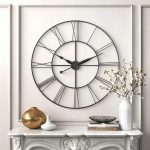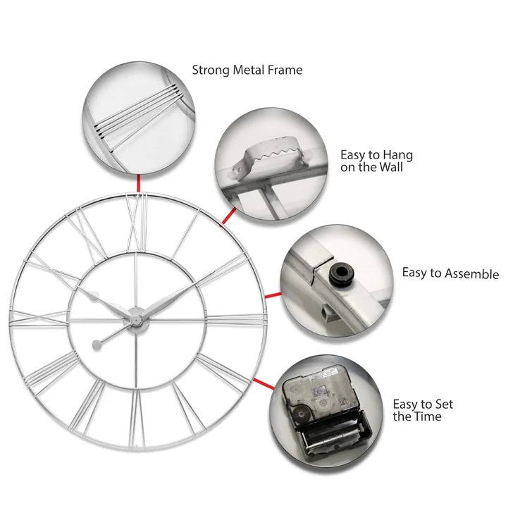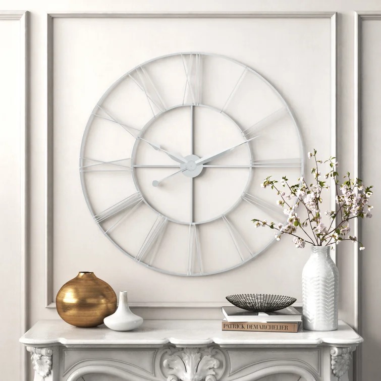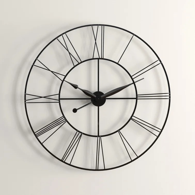Hang some vintage appeal on your wall with this striking wall clock, the perfect finishing touch for your French country or farmhouse ensemble. Crafted from steel in a neutral finish, it showcases a slim, open frame with simple Roman numerals for a crisp finishing touch. This clock ensures it makes a big impact wherever you decide to hang it. And yes, before you ask, this clock does make a ticking noise, but its size makes a bigger impact. Hand-curated by Kelly Clarkson.