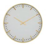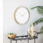 Glamour meets sophistication in this gold tone clock perfect for solid dark background. Requires 1 AA battery. Battery not included. This item ships in 1 carton. Features vertical dash with minutes markers. The clock mechanism runs silent. Metal secure loop backing for easy hang; nails and screws are not included. Suitable for indoor use only. Contemporary style.
