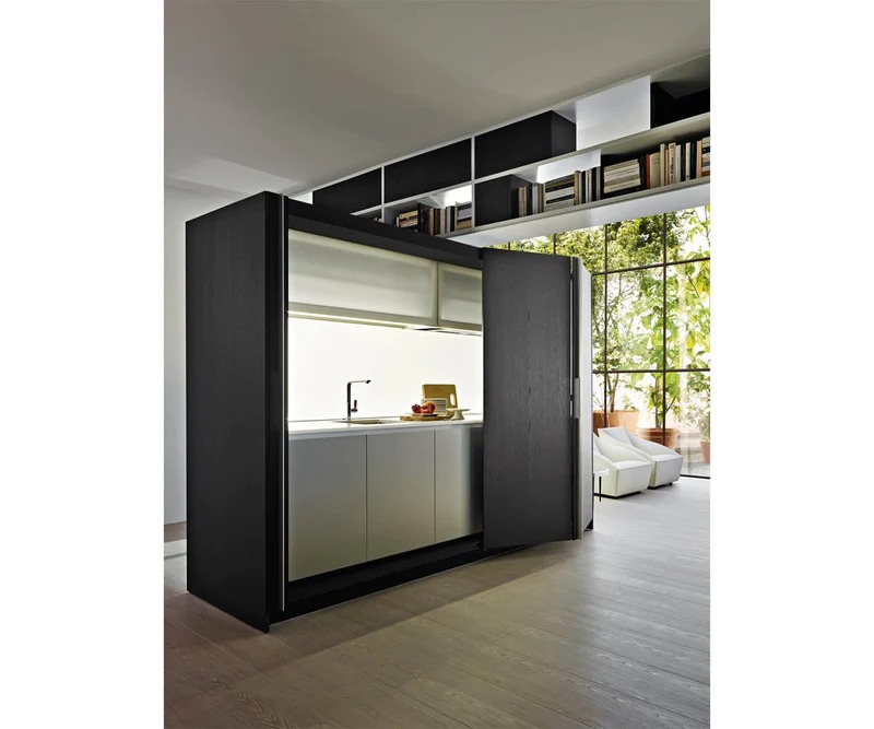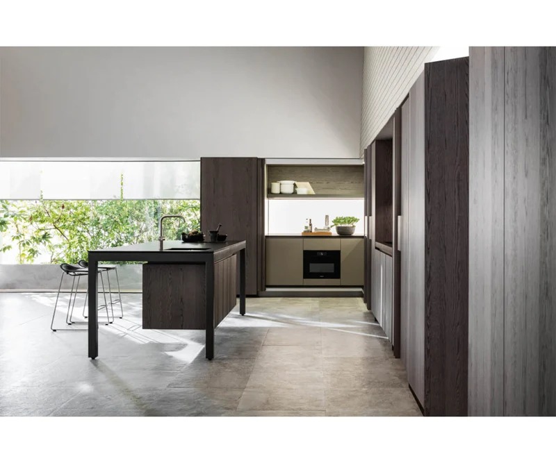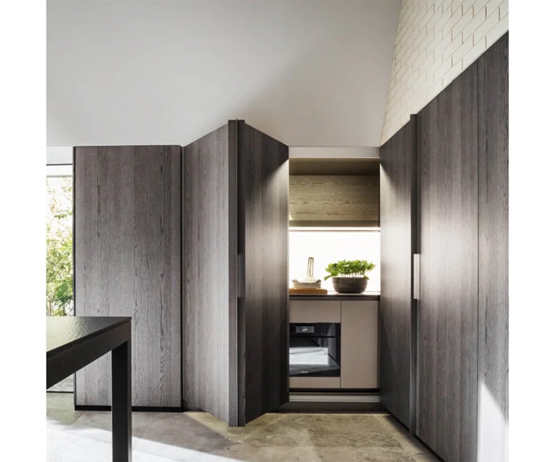 Changing in 2016 from a linear to a corner solution, Tivali is more than just a kitchen, it is a highly functional space that seems to appear and vanish magically, as needed. The large doors are able to disappear into the side compartments fluidly, thanks to Dada’s exclusive patented mechanism, and the lighting is striking but subtle, with the back panel designed as an LED-lit wall.